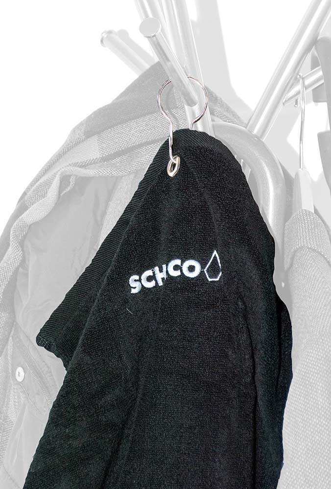 Das gezeigte Golftuch misst 40×60 cm und ist konfektioniert mit Öse und dem bewährten Aufhänger. Damit hält das Tuch sicher an Golf Caddys, aber auch an Sportgeräten, Umkleidekabinen oder Garderoben.