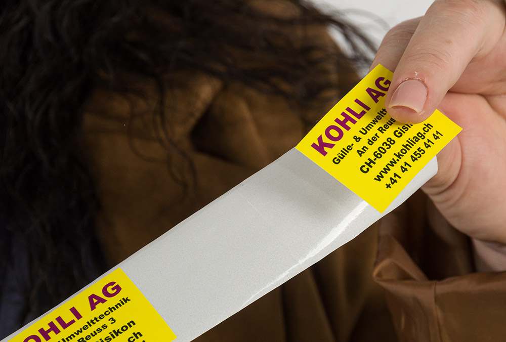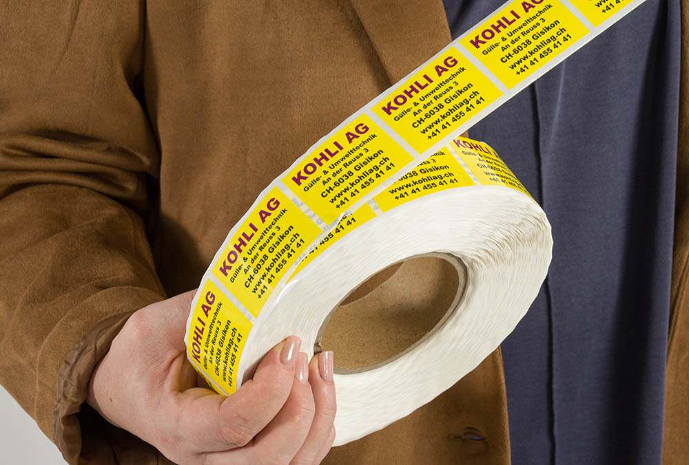 Diese ansprechenden, gut haftenden Aufkleber sind aus einer Folie in der Stärke von 0.1mm mit Laminierung gemacht. Das abgebildete Beispiel zeigt für die KOHLI AG realisierte Aufkleber in der Grösse von 3.5×5 cm.