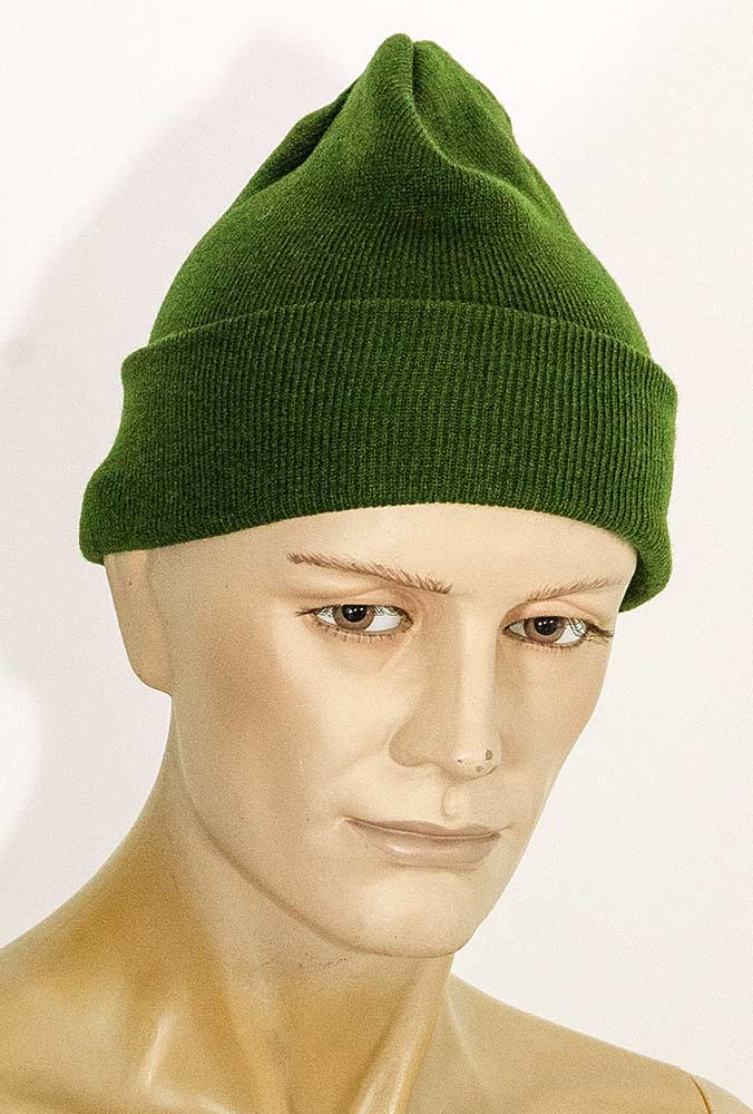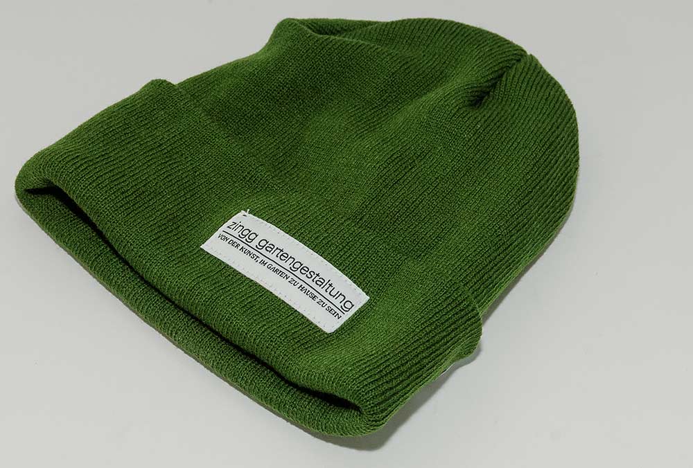 Abbildung zeigt Strickmütze in Forstgrün mit gewobenem Abzeichen.