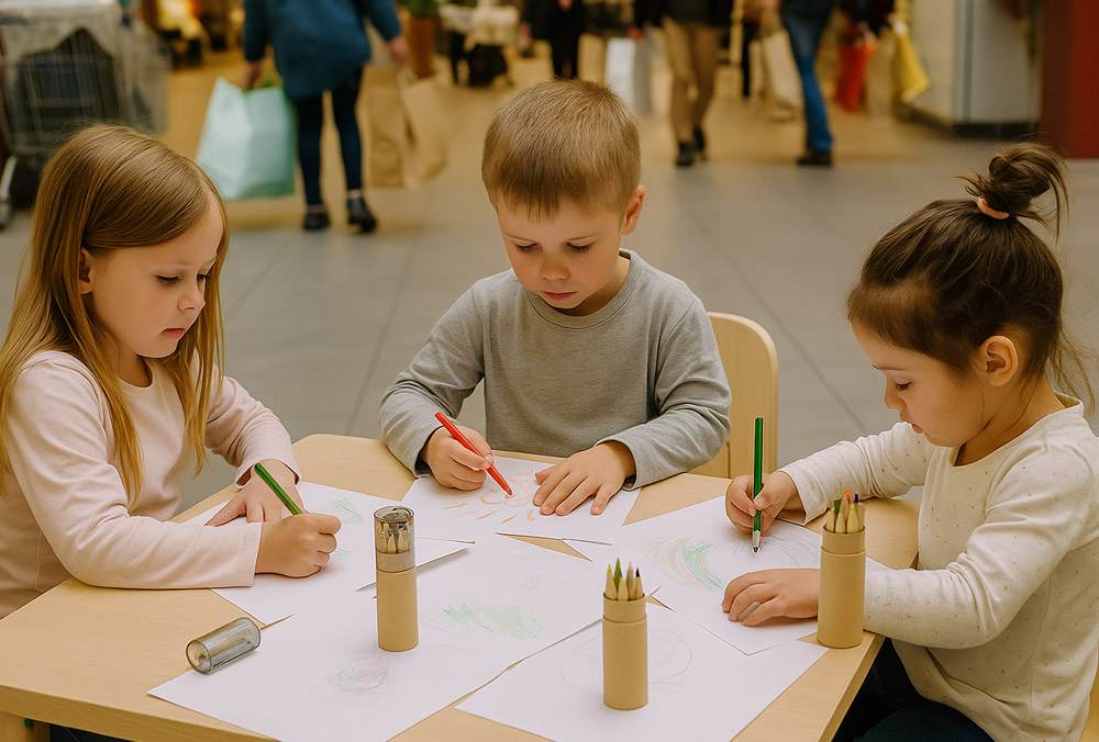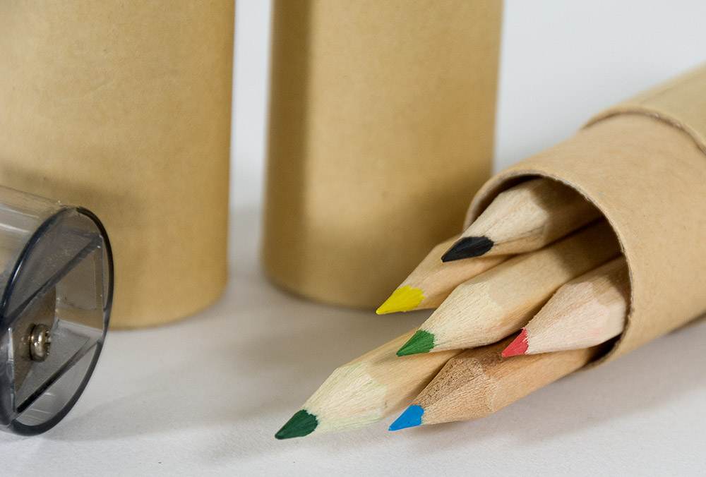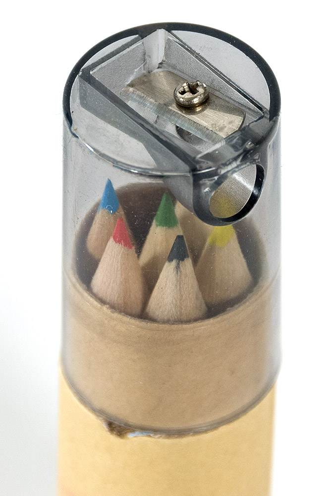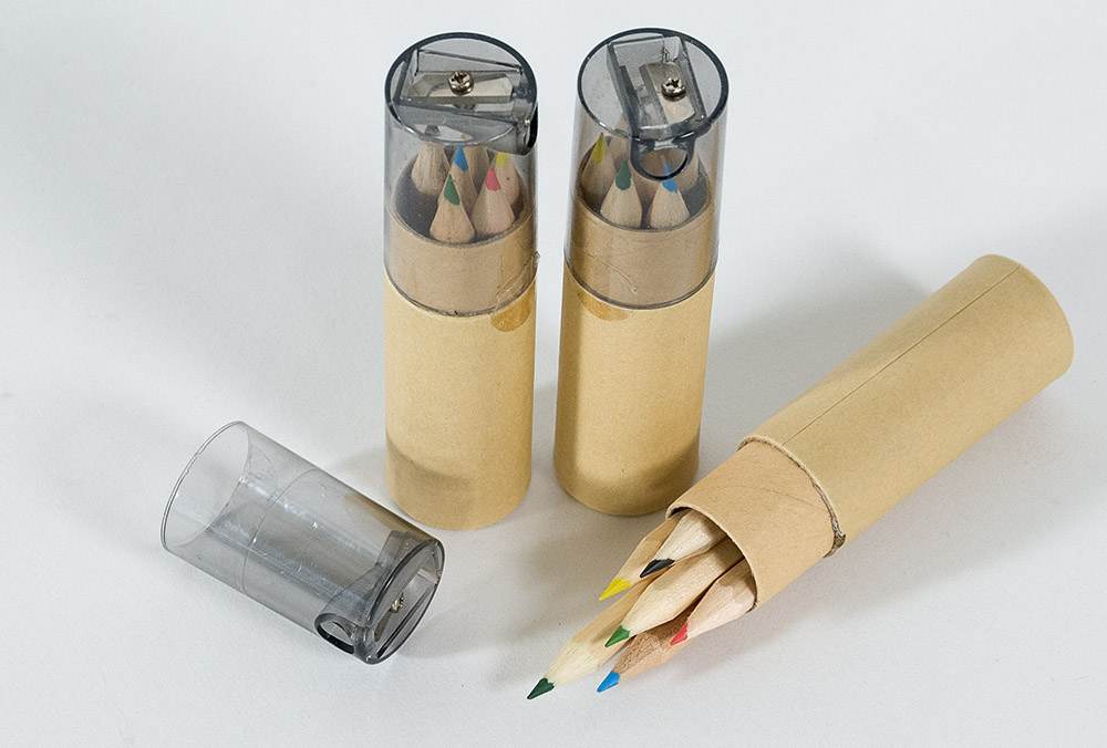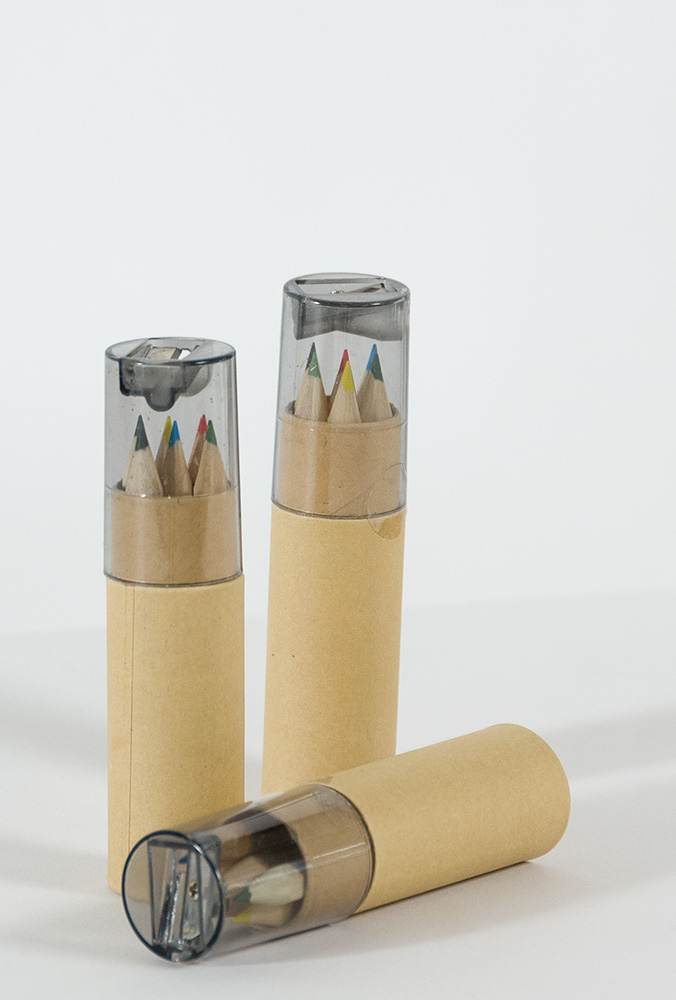 Farbstifte in Mini-Röhrenkarton mit Durchmesser 25×107 mm. Der Deckel ist transparent und enthält einen Spitzer für Farbstifte und Bleistifte. Gefüllt ist der Karton mit 6 Farbstiften in der Länge 85 mm in gelb, hellgrün, dunkelgrün, schwarz, blau und rot.