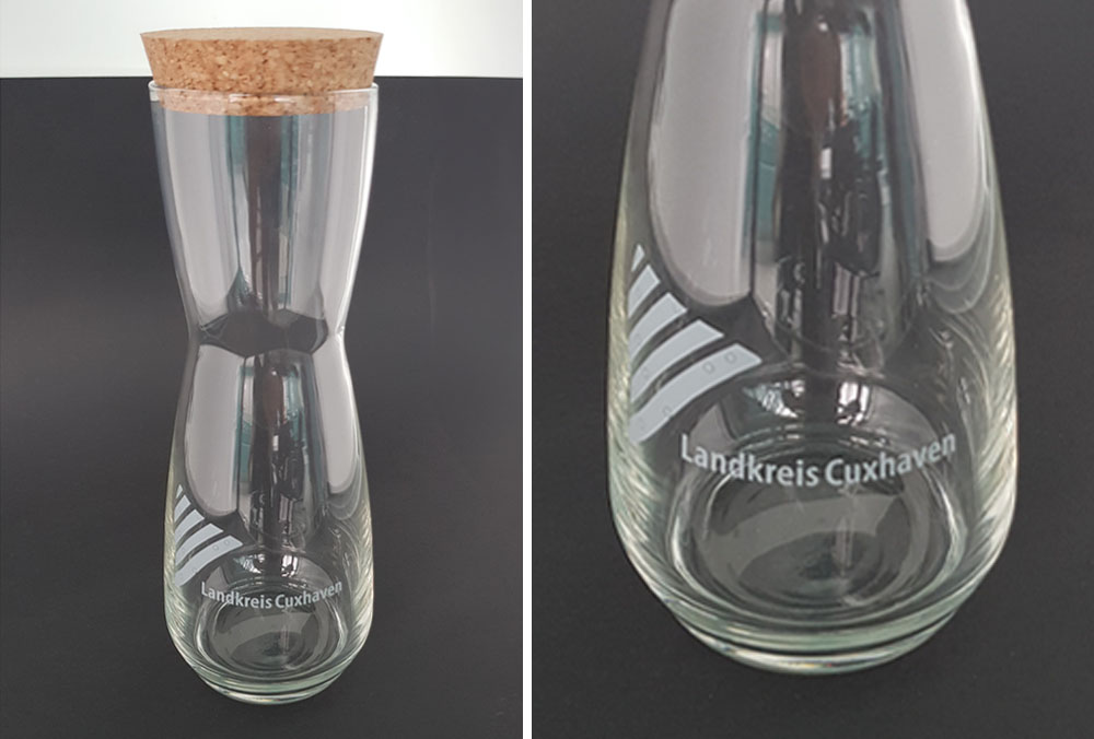 Glaskaraffe mit Korkdeckel bedruckt ganz nach Ihren Wünschen.