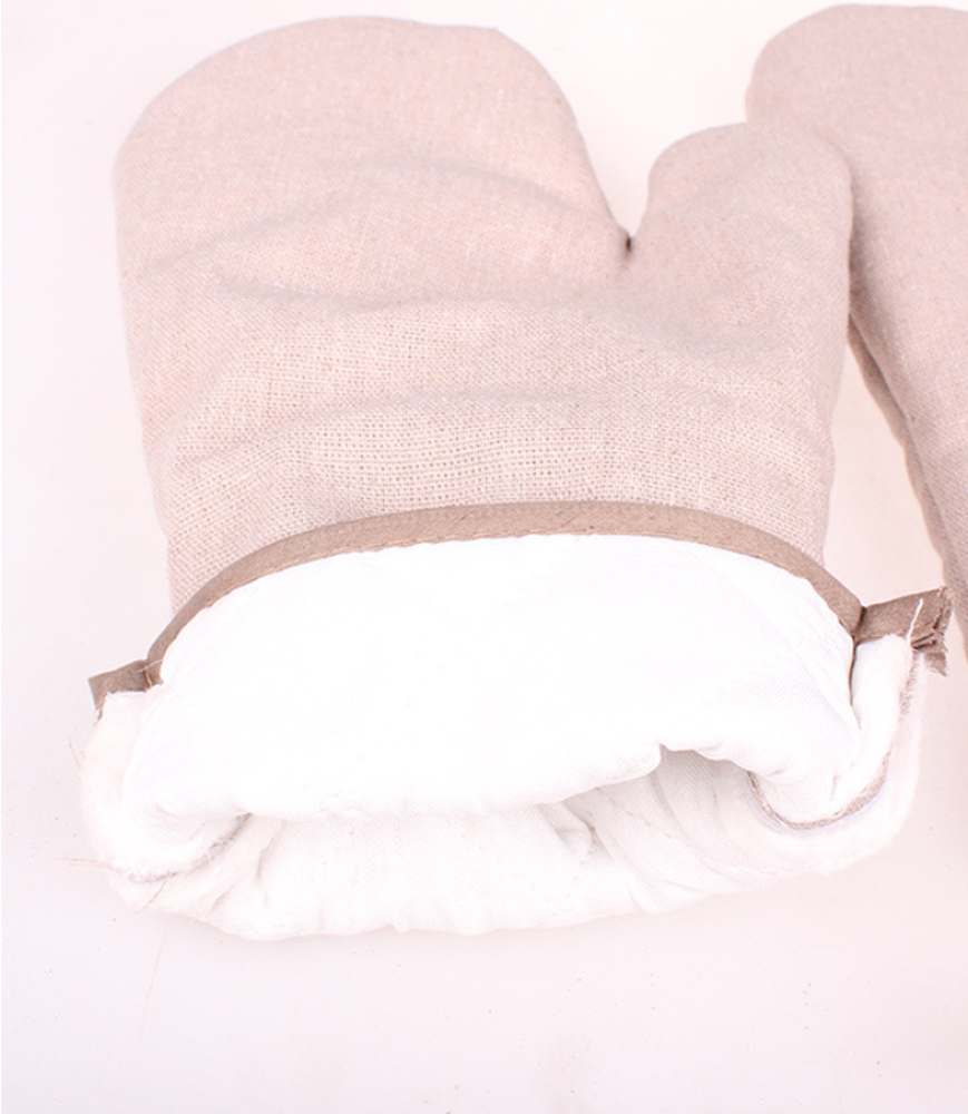 Die Abbildung zeigt die Ofenhandschue von TERRETAX in der Grösse 29×16.5 cm. Das Aussengewebe ist aus einem Baumwolle-Leinen-Gemisch, extra eng und stark gewoben. Innen mit abgesteppter Fütterung.