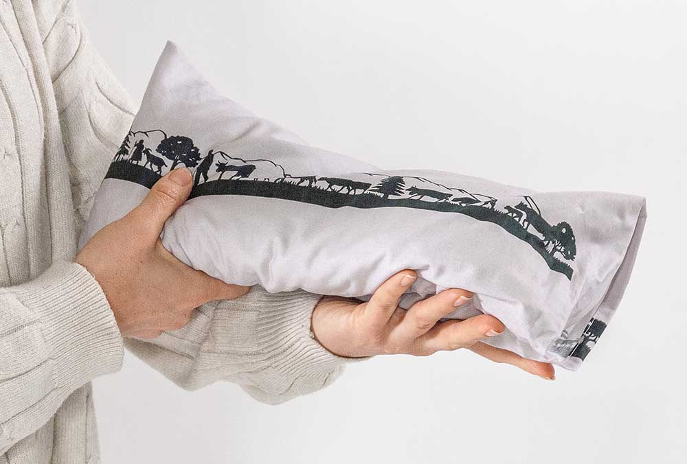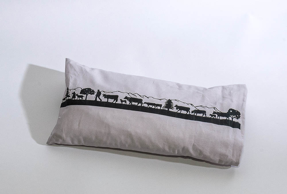 Überzug vollflächig beliebig farbig bedruckt möglich. Das Kissen ist gefüllt mit 1000g Kirschkernen. Grösse ca. 20×35 cm. Material starkes, enggewobenes Baumwollgewebe. Aussenbezug aus feinem Baumwollgewebe und gut waschbar. Innerhalb einer Fabrikation von ca. 500 Stück sind verschieden Sujetdrucke möglich.