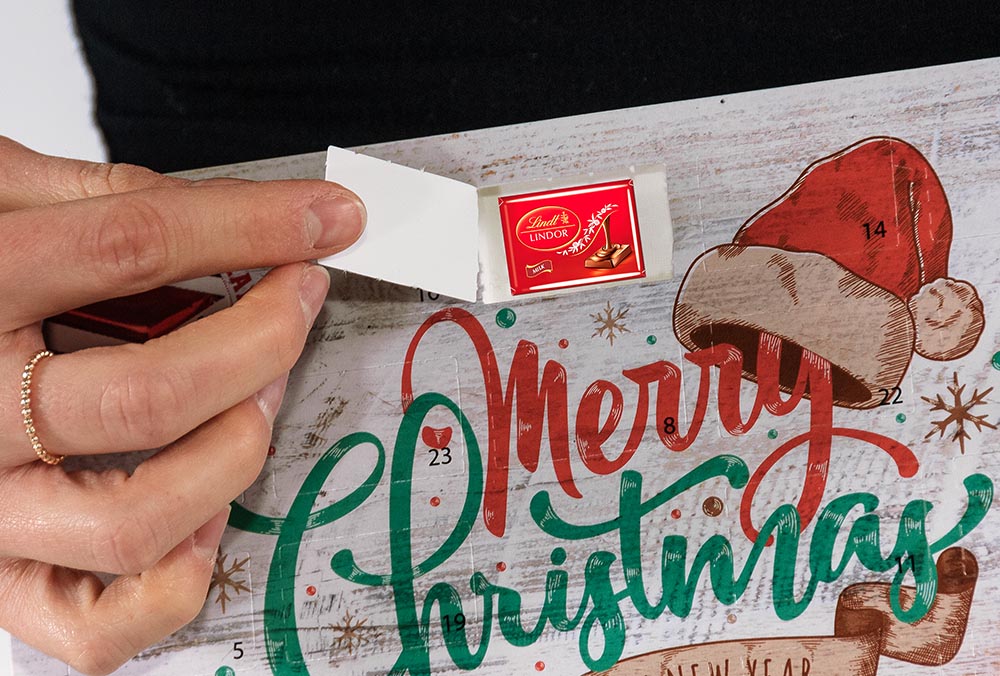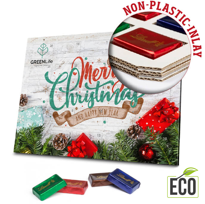 Ein sympathischer Adventskalender, der komplett ohne Plastik auskommt. Hergestellt aus FSC-zertifiziertem Karton. Gefüllt mit 120g zartschmelzenden Lindor Schokoladen- Naps. Der Adventskalender kann nach 4c Euroskala in Ihrem Design bedruckt werden.