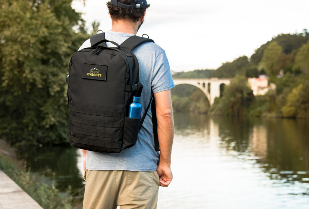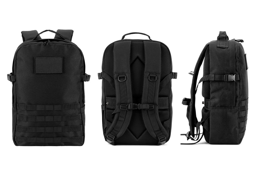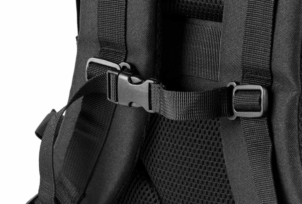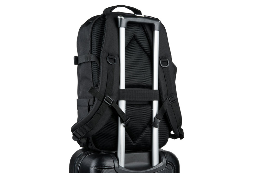 Ganz aus 600D- Recyclingpolyester, extra eng gewoben. Mit einem 210D- Recyclingpolyester Futter ausgestattet. Rucksack mit Alptopfach, mehreren Innseitigen Taschen, von auch eine mit Reissverschluss. Sowie Seitentasche und vieles mehr wie Kompressionsriemen, verstellbare Gurtbänder und einen Extra Trolleygurt.