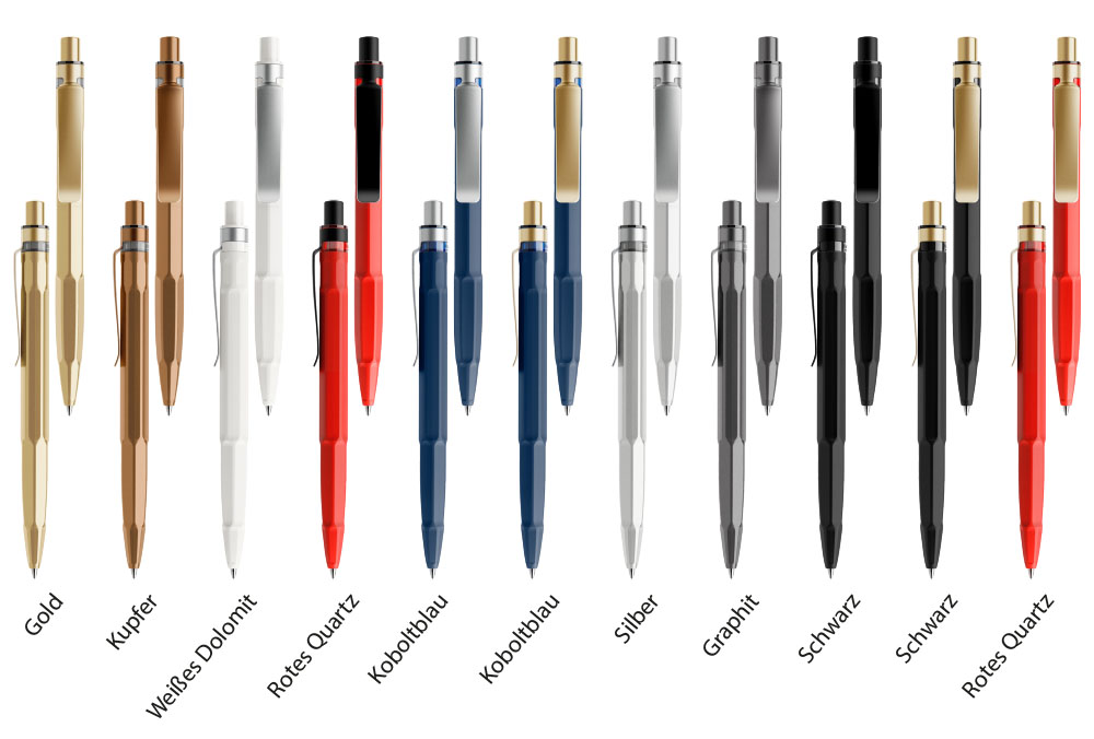Zusätzlich bieten wir die Ausführung “Stone” an, bei der das Gehäuse aus einem Spezialkunststoff mit Mineralienzusatz gefertigt wird. Der Stift ist standardmäßig mit einem satinierten Metall-Clip ausgestattet.
