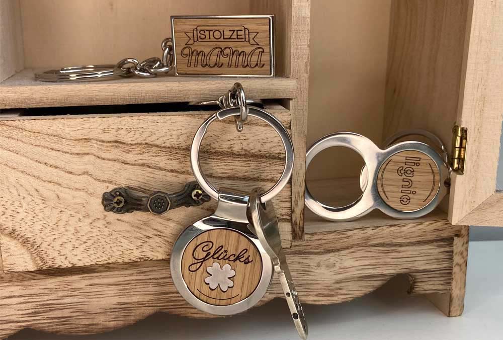 Die Schlüsselanhänger sind qualitativ hochwertig und aus FSC-zertifiziertem Eichenholz hergestellt.