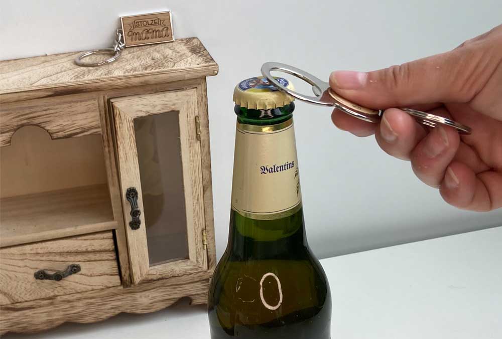 Zusätzlich ist der Schlüsselanhänger mit Flaschenöffner– Funktion ausgestattet, was ihn unterwegs zum nützlichen Begleiter macht.
