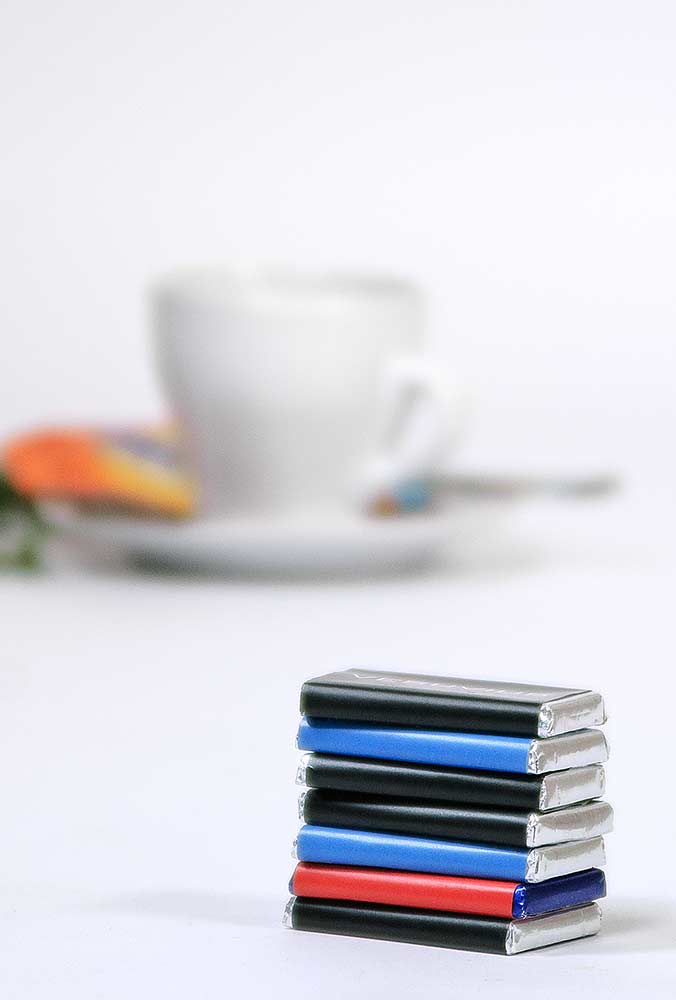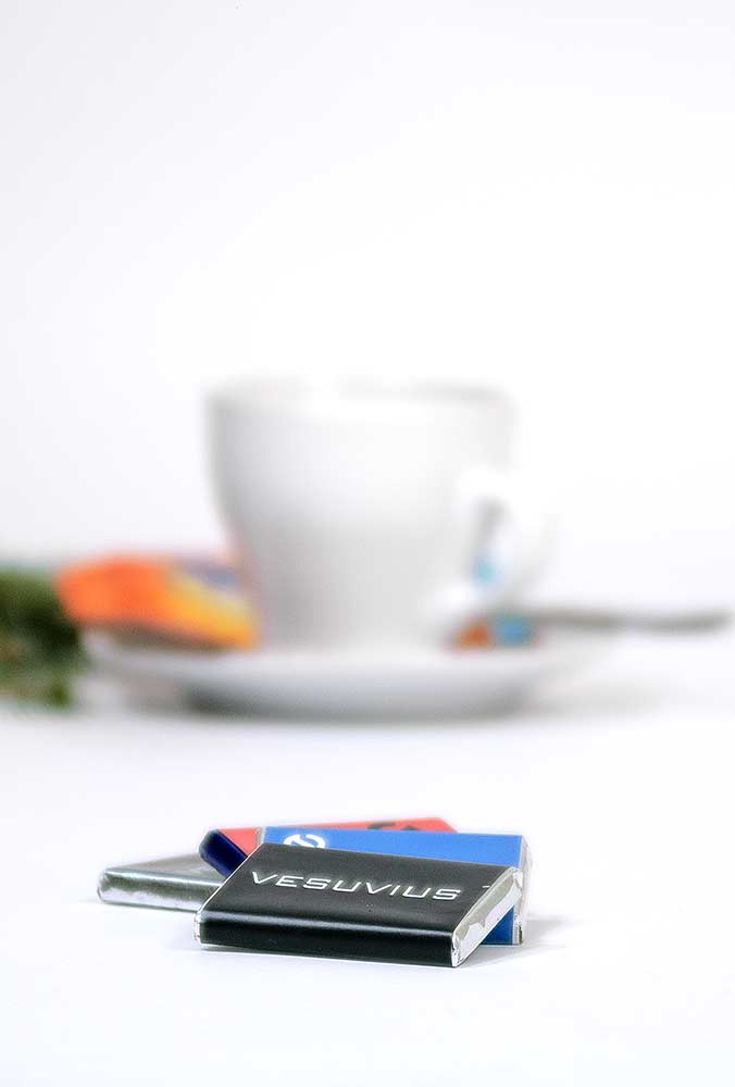 Die Napolitains haben eine handliche Form. Die Barry Callebaut Schokolade misst 4×5.5 cm und ist umhüllt von glänzender Lebensmittelfolie. Auf dem Papierwickel kann Ihr Logo beliebig gedruckt werden.