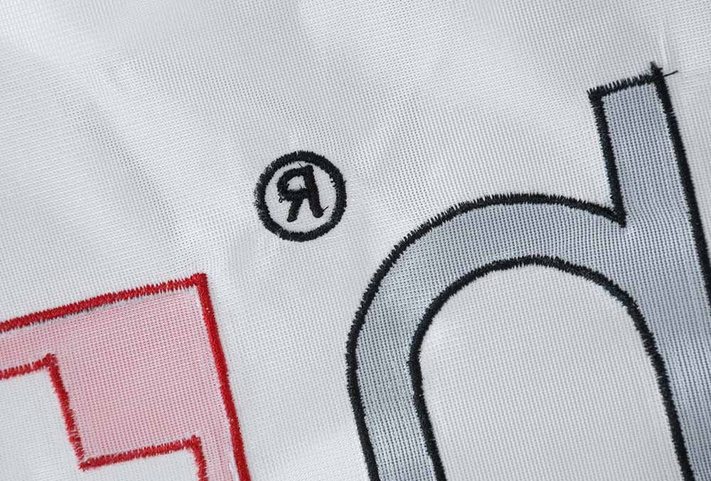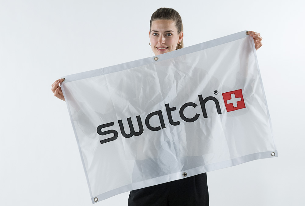 Die Fahne ist genäht mit Stoff auf Stoff. Das abgebildete Beispiel von Swatch ist der genähte schwarze Schriftzug mit rot-weisser Flagge auf auf weissem Grund.